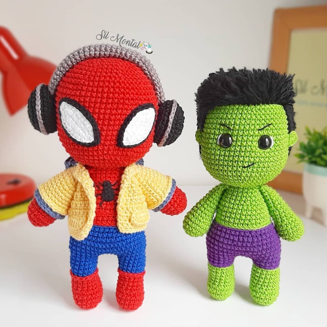 Utilizando fio Amigurumi e agulha de crochê 2 mm Hulkinho fica aproximadamente com 21 cm e Menino Aranha 22 cm.
